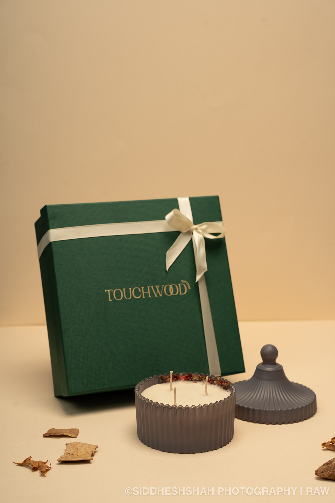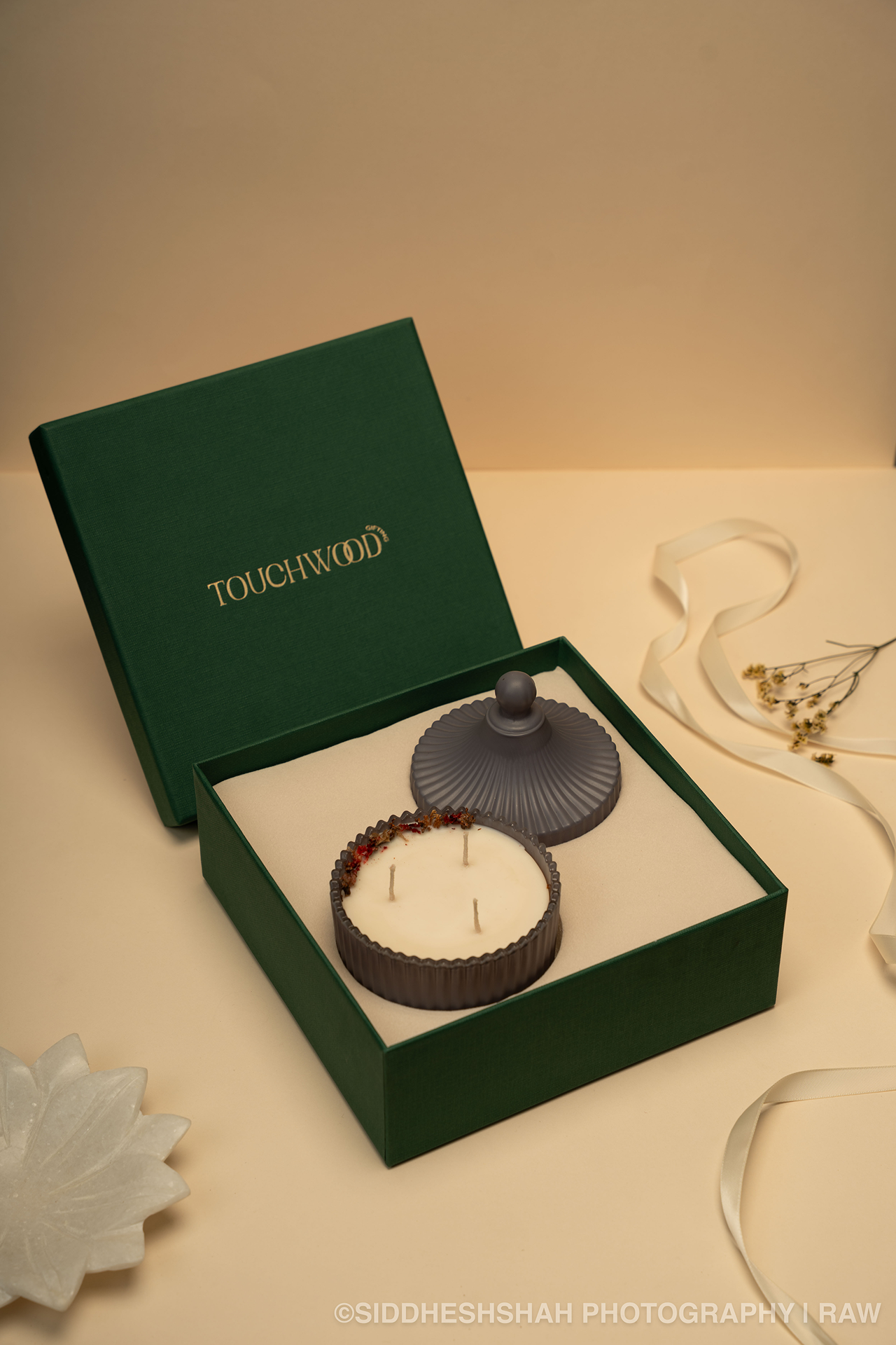 A ribbed frosted-glass vessel—our Soraya, the “jewel of the sky”—cradles a hand-poured, triple-wick soy candle dusted with dried botanicals and a whisper of gold. Clean-burning and richly perfumed with midnight jasmine and vanilla nebula, it arrives nestled in Touchwood’s hallmark green gift box—an invitation to bask in celestial warmth and quiet luxury.